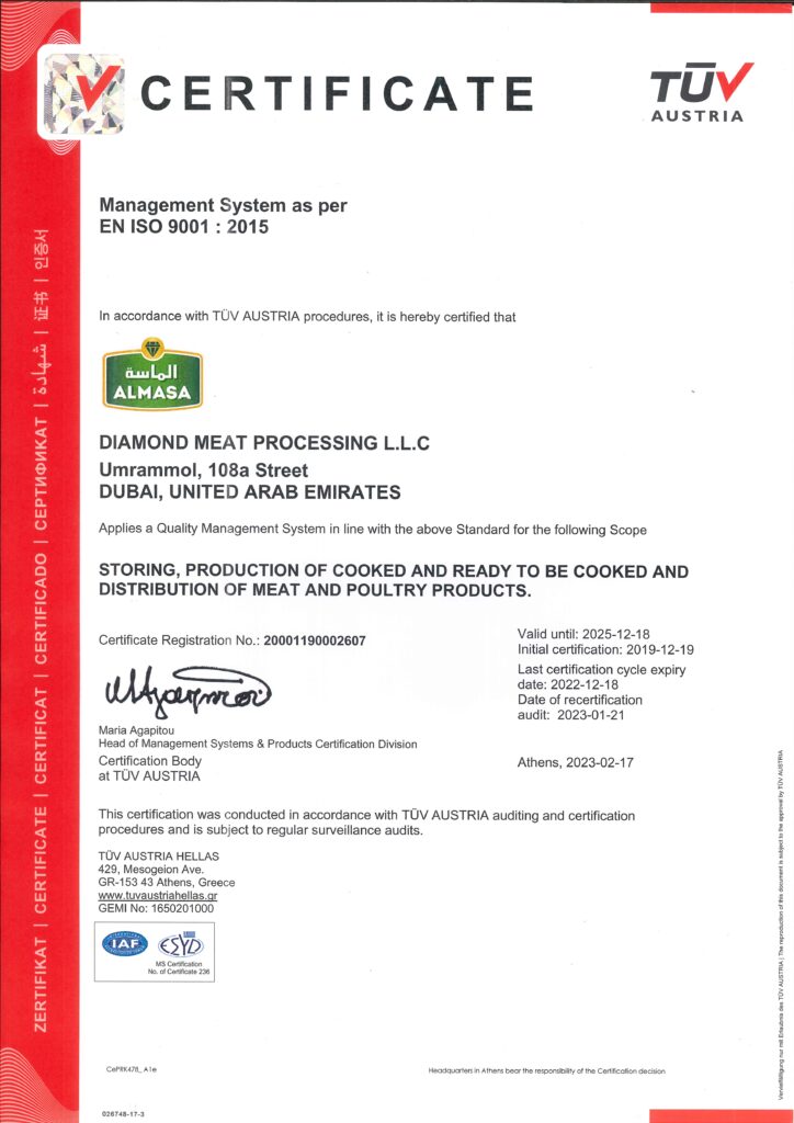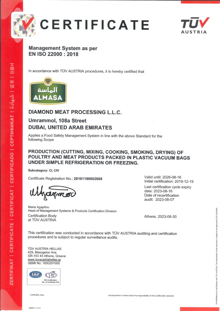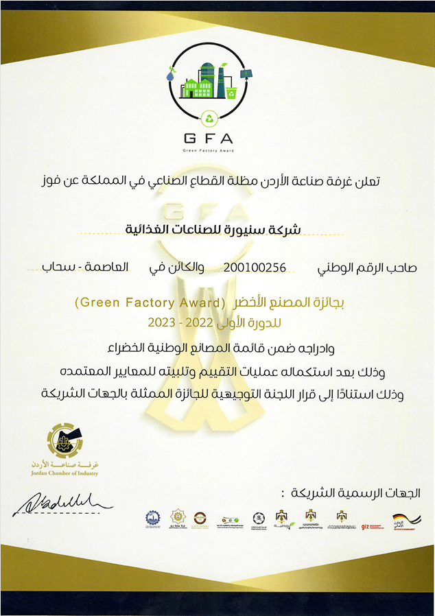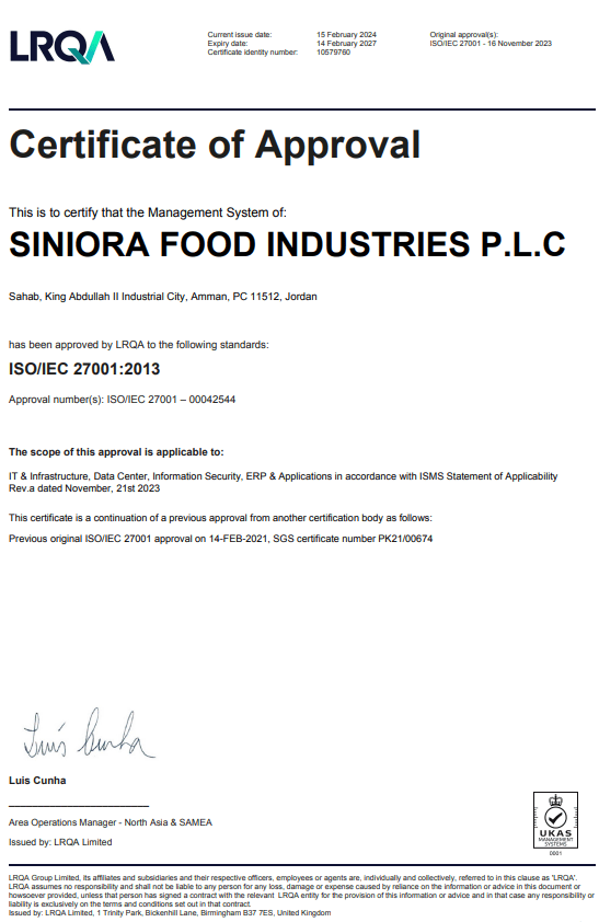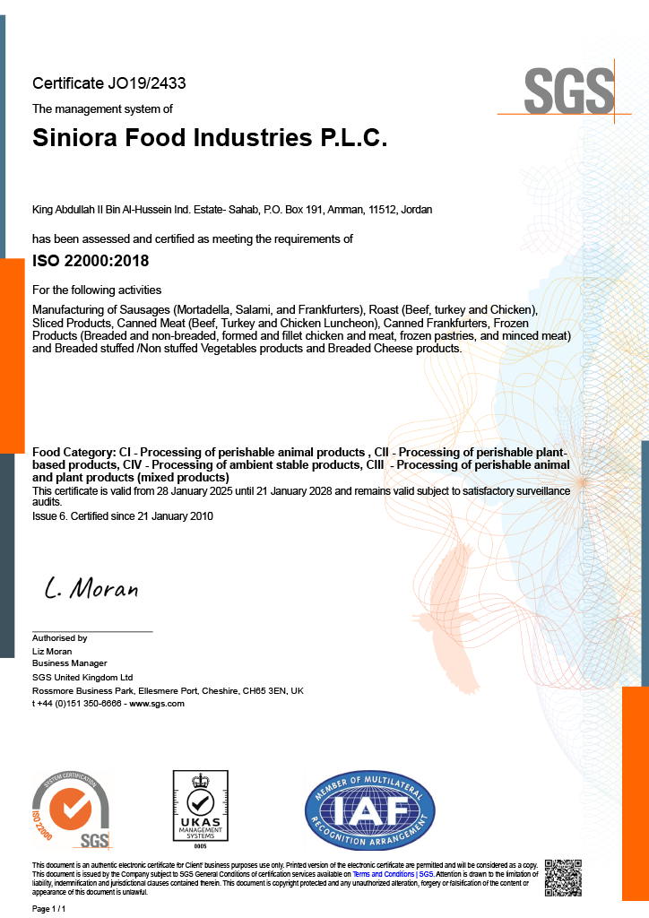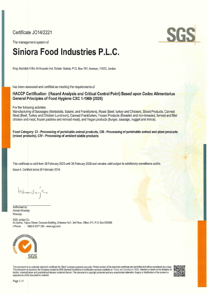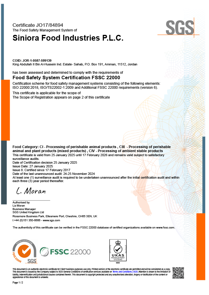 Siniora Food Industries holds the International Standard recognized ISO 9001:2008. The Company´s accreditation covers quality control procedures and processes associated with its products and training activities. In addition, Siniora holds the International Standard recognized ISO22000 and the HACCP system that cover food safety procedures and processes associated with Siniora ´s products.